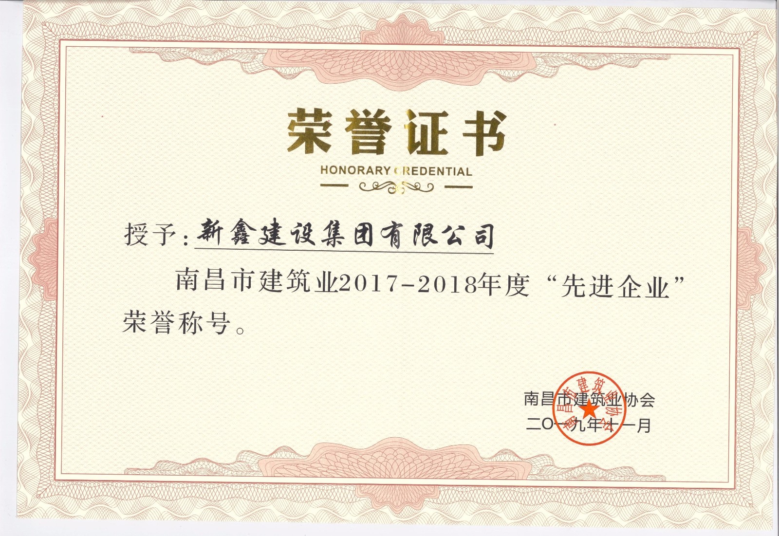 新鑫建設(shè)集團有限公司榮獲南昌市建筑業(yè)2017-2018年度先進企業(yè)榮譽